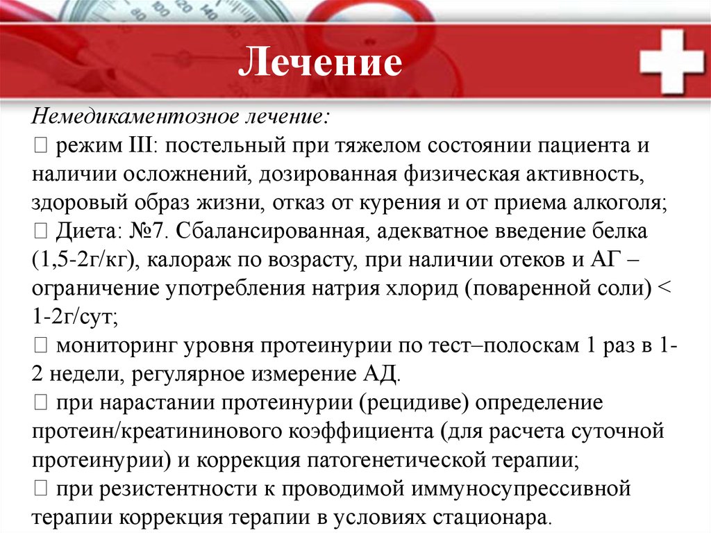 мониторинг уровня протеинурии по тест–полоскам 1 раз в 12 недели, регулярное измерение АД.