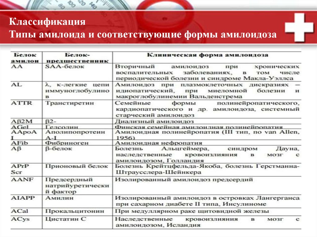 КлассификацияТипы амилоида и соответствующие формы амилоидоза