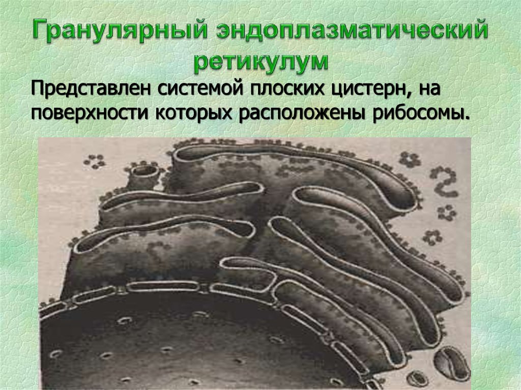 Представлен системой плоских цистерн, наповерхности которых расположены рибосомы.