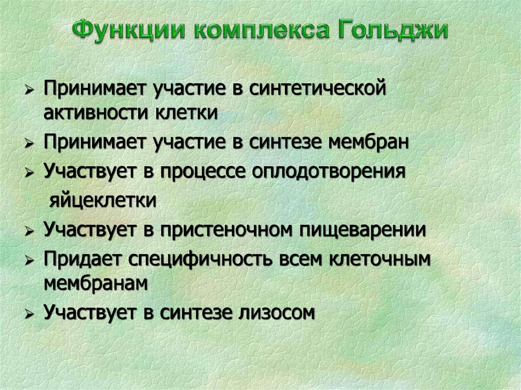 Участвует в синтезе лизосом