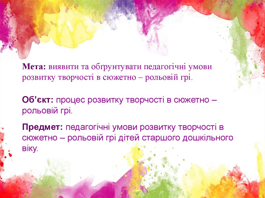 Мета: виявити та обґрунтувати педагогічні умовирозвитку творчості в сюжетно – рольовій грі.
