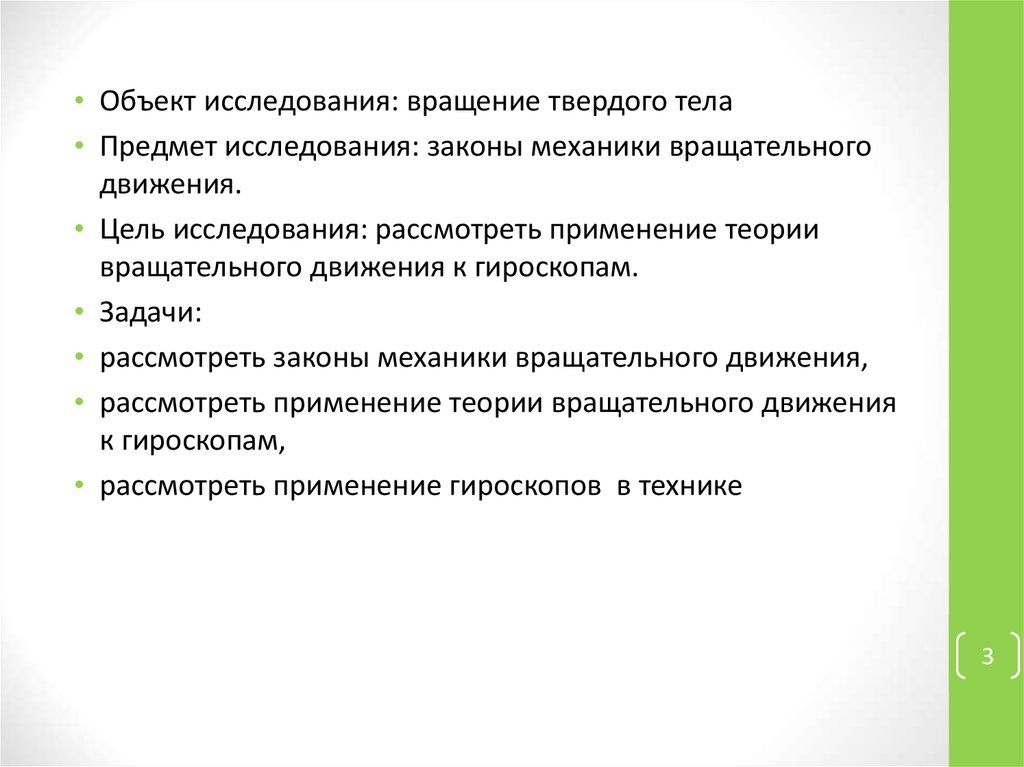 • Объект исследования: вращение твердого тела• Предмет исследования: законы механики вращательного