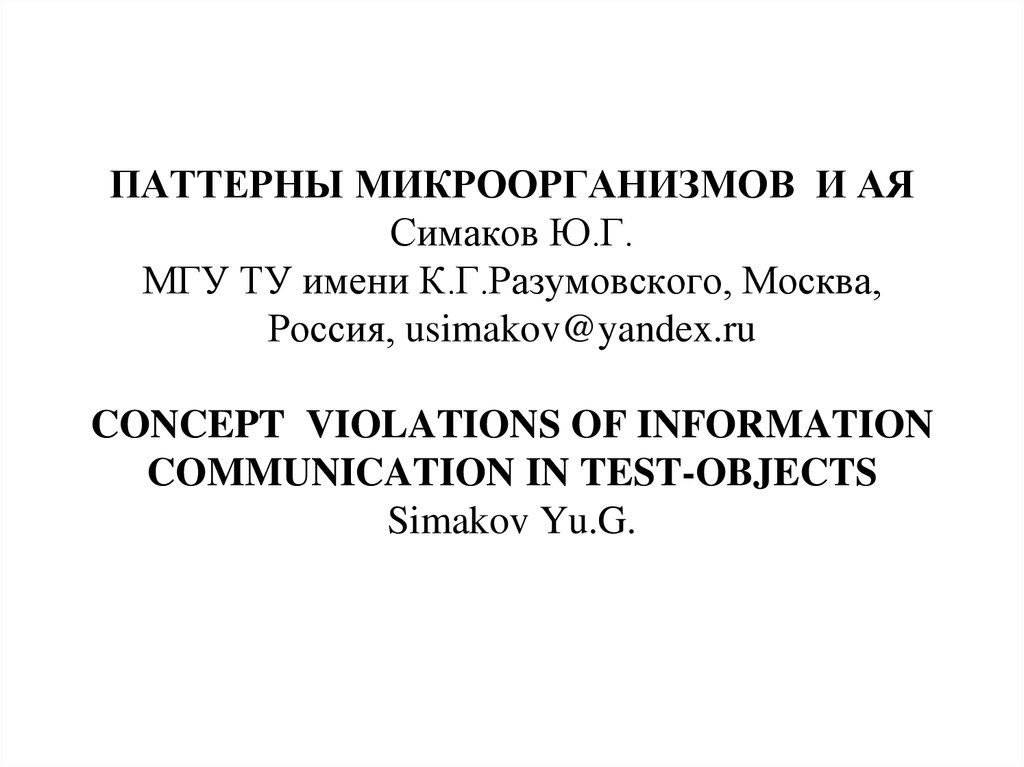 1. ПАТТЕРНЫ МИКРООРГАНИЗМОВ И АЯ Симаков Ю.Г. МГУ ТУ имени К.Г.Разумовского, Москва, Россия, usimakov@yandex.ru CONCEPT