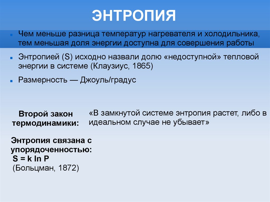 Энтропией (S) исходно назвали долю «недоступной» тепловой