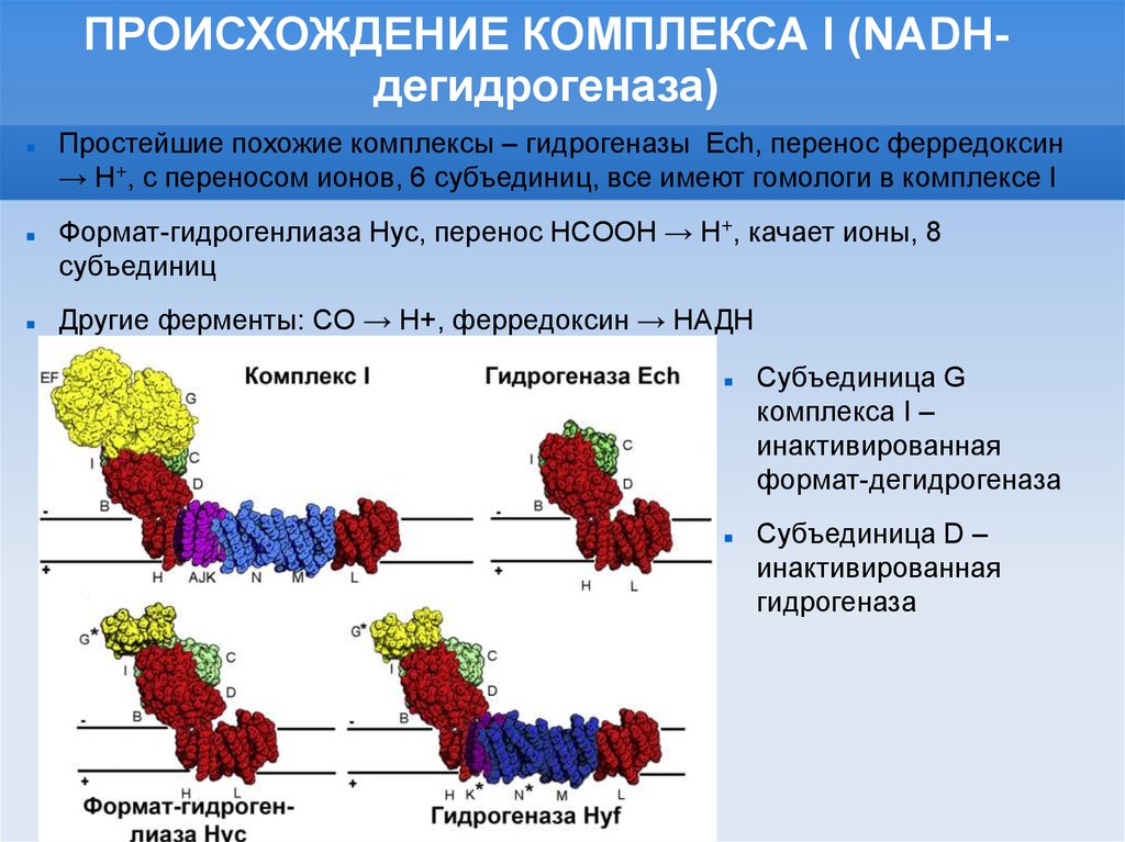 ПРОИСХОЖДЕНИЕ КОМПЛЕКСА I (NADHдегидрогеназа)Простейшие похожие комплексы – гидрогеназы Ech, перенос ферредоксин