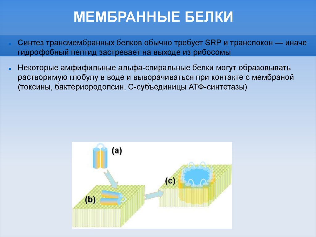 МЕМБРАННЫЕ БЕЛКИСинтез трансмембранных белков обычно требует SRP и транслокон — иначе