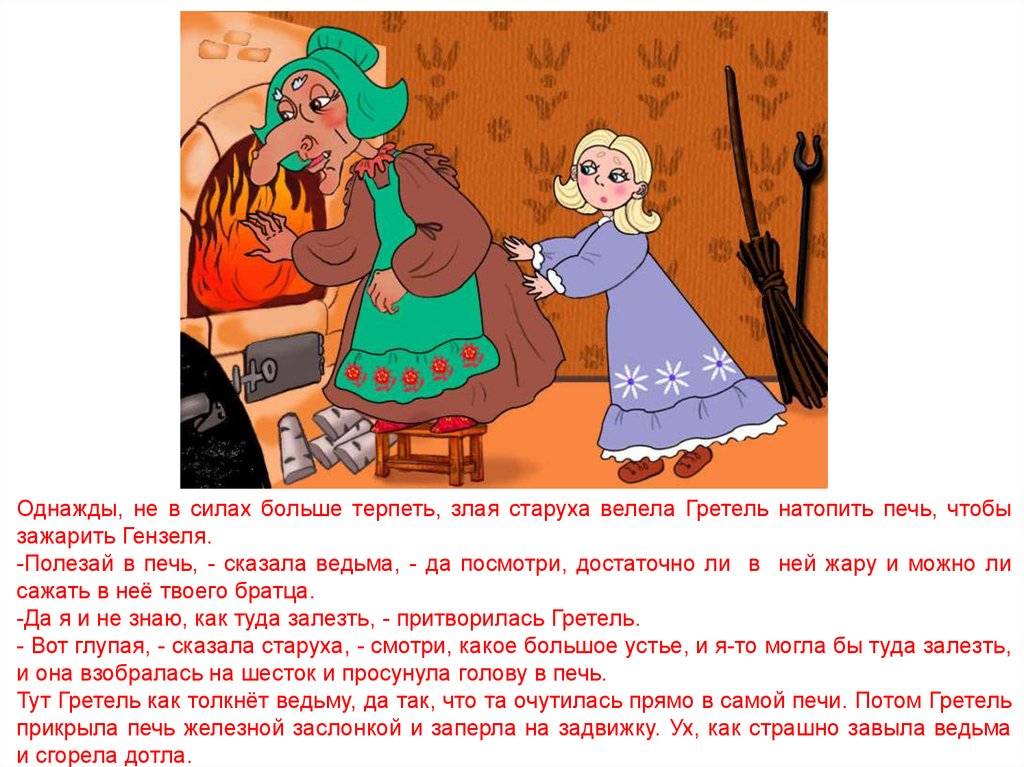 Тут Гретель как толкнёт ведьму, да так, что та очутилась прямо в самой печи. Потом Гретель