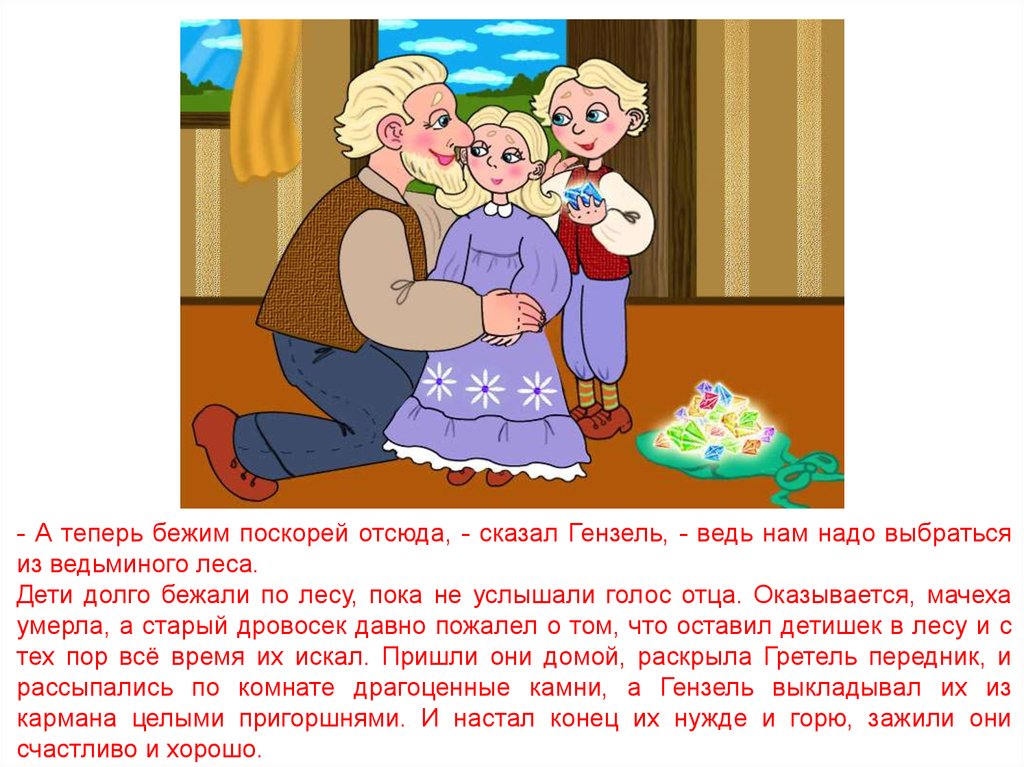 Дети долго бежали по лесу, пока не услышали голос отца. Оказывается, мачеха