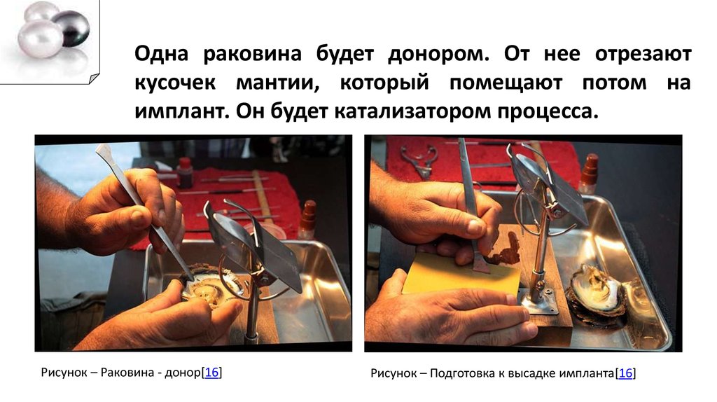 Одна раковина будет донором. От нее отрезаюткусочек мантии, который помещают потом на