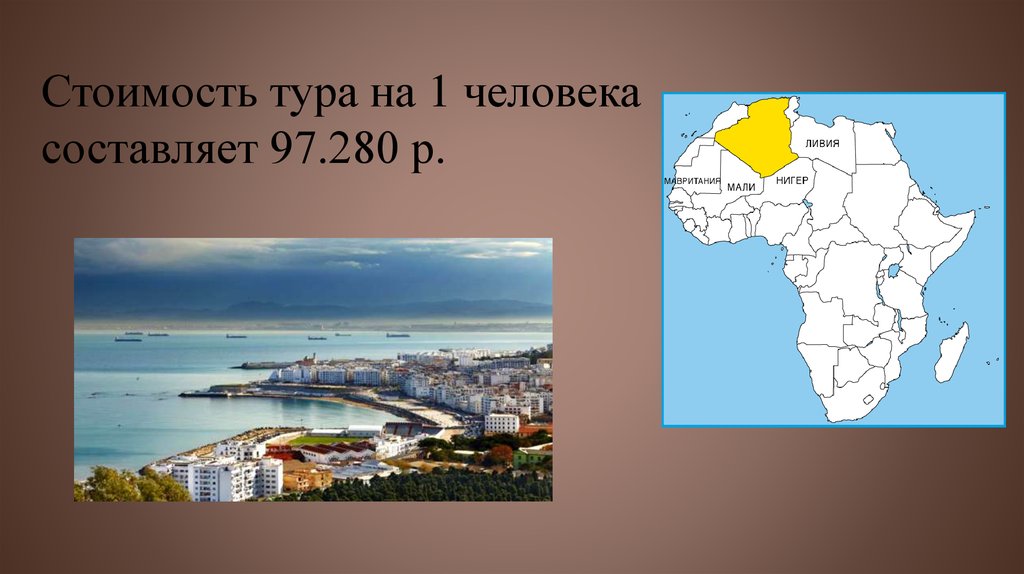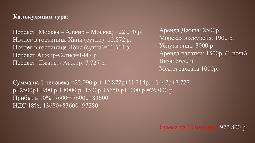 Калькуляция тура:Перелет: Москва – Алжир – Москва; =22.090 р.