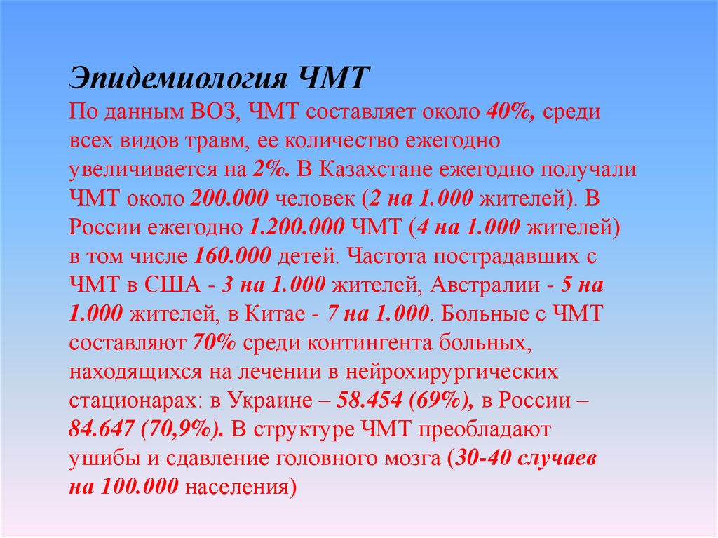 Эпидемиология ЧМТПо данным ВОЗ, ЧМТ составляет около 40%, среди