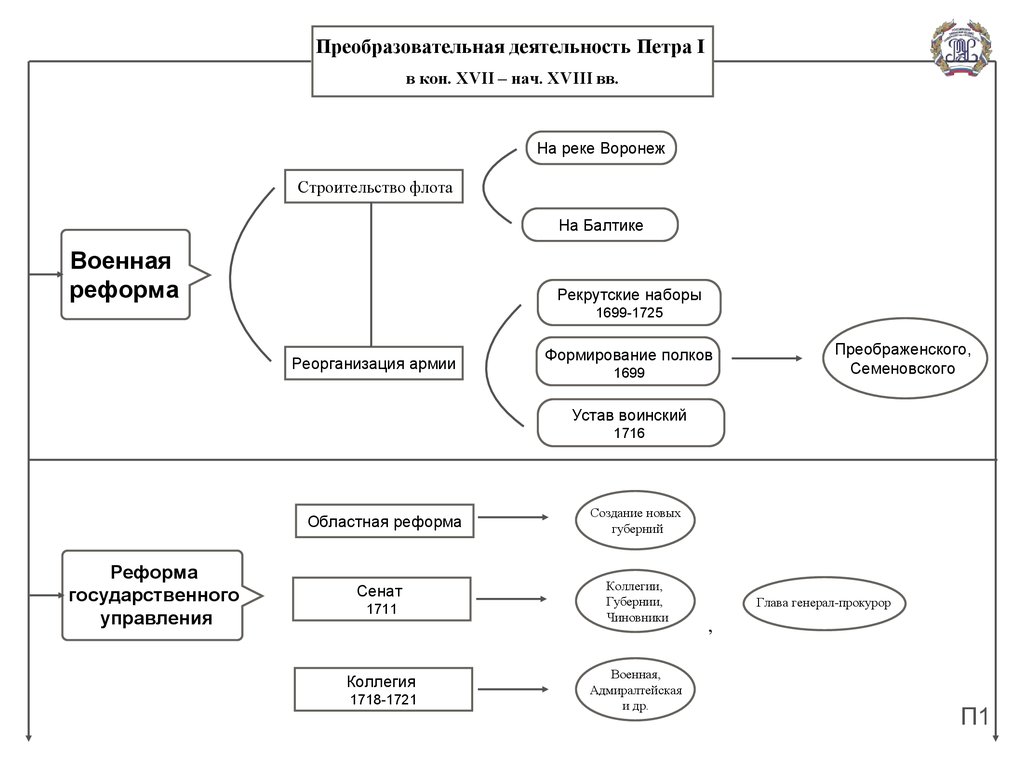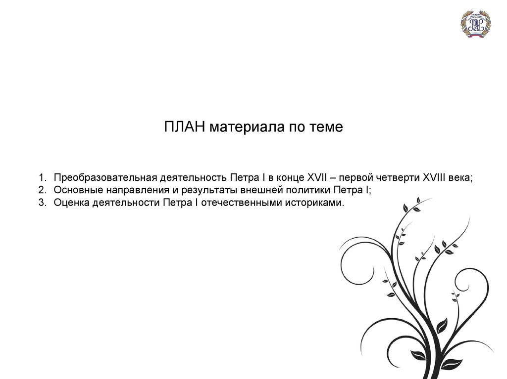ПЛАН материала по теме1. Преобразовательная деятельность Петра I в конце XVII – первой четверти XVIII века;
