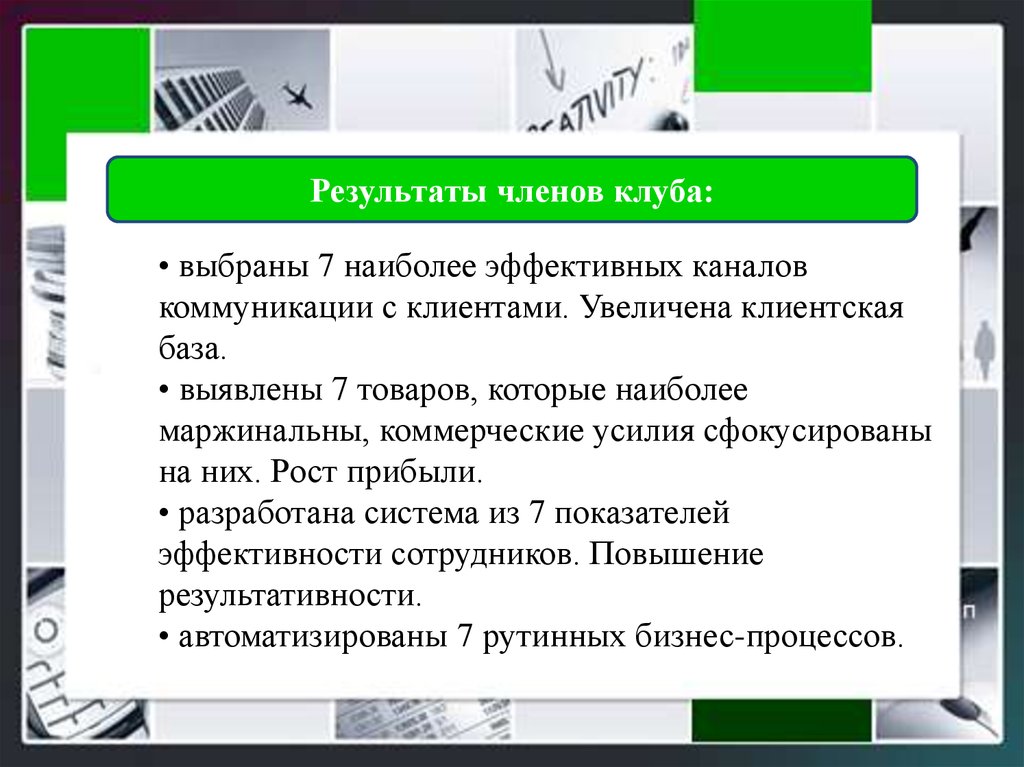 Результаты членов клуба:• выбраны 7 наиболее эффективных каналов