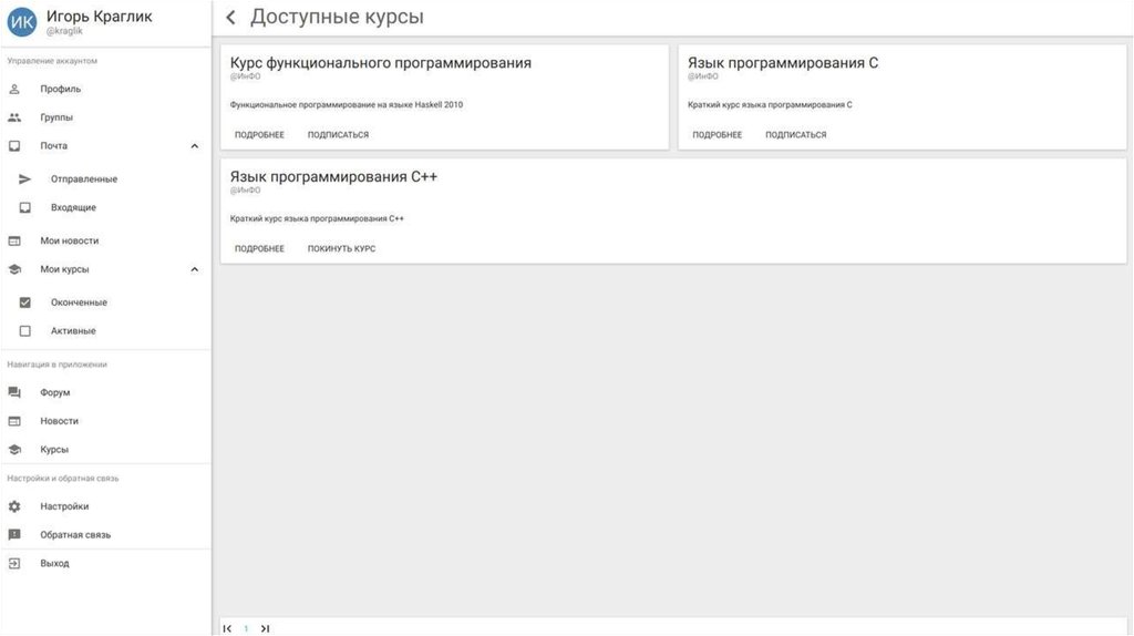 1. Front-end(ES6, React, Redux, React-Router, React-md)2. Сервер курсов(Celery, сервер - Gunicorn,