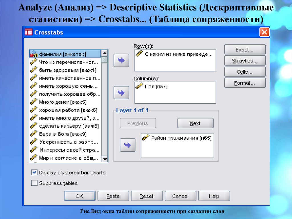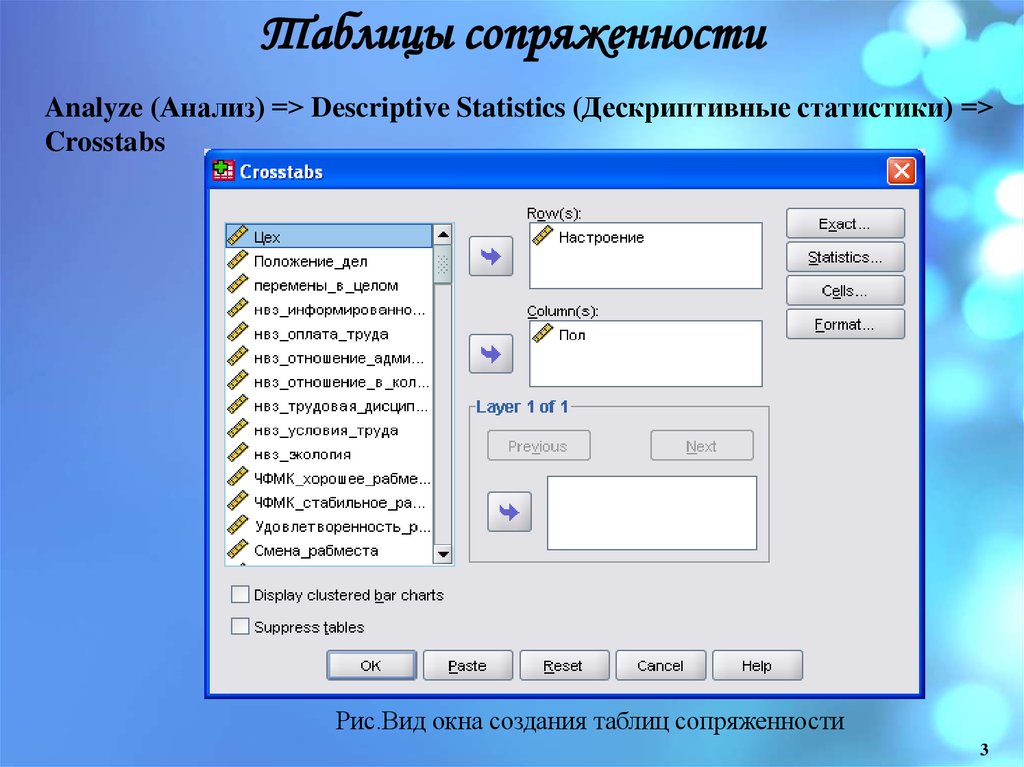 Analyze (Анализ) => Descriptive Statistics (Дескриптивныестатистики) => Crosstabs... (Таблица сопряженности)