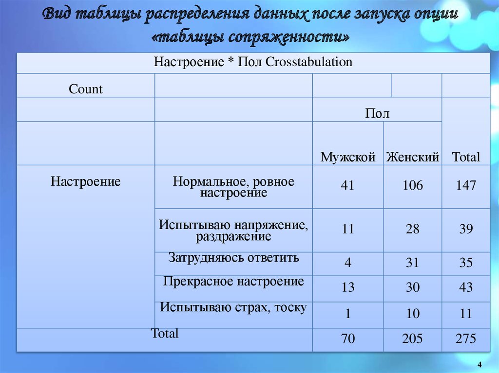 Вид таблицы распределения данных после запуска опции«таблицы сопряженности»