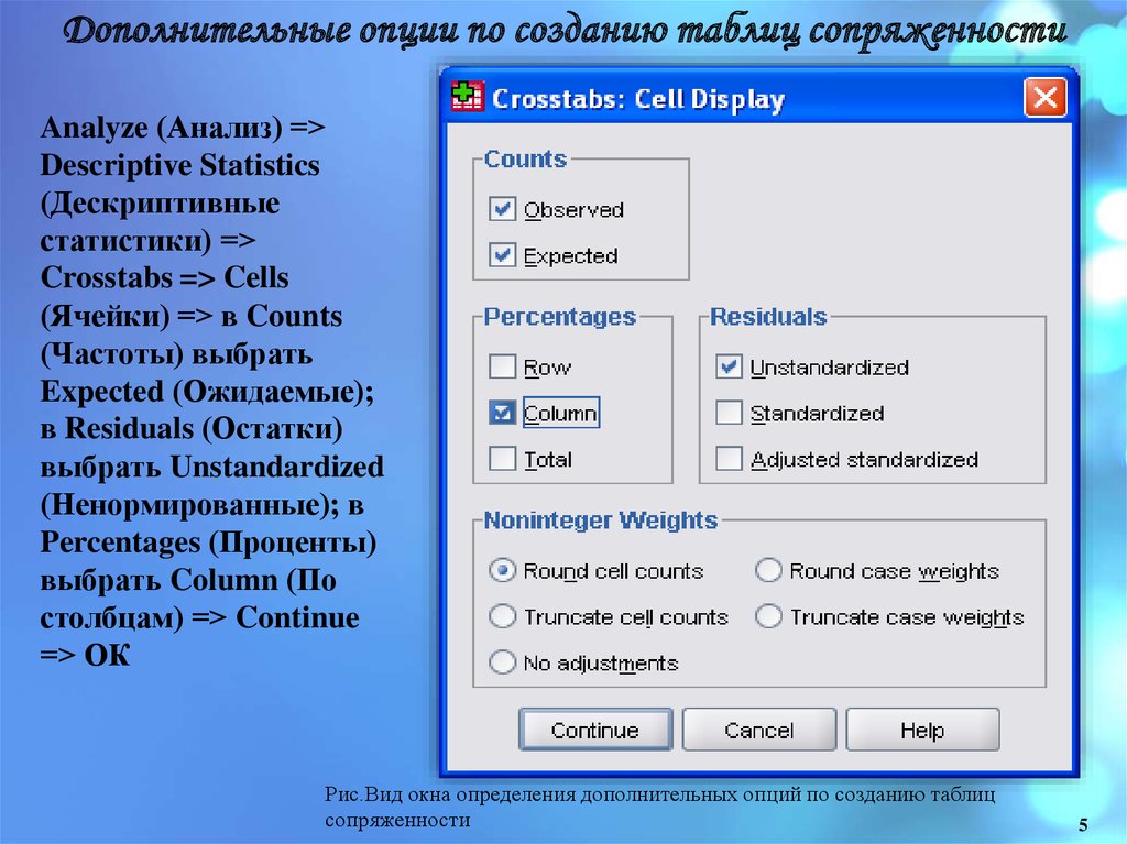 Дополнительные опции по созданию таблиц сопряженностиAnalyze (Анализ) =>