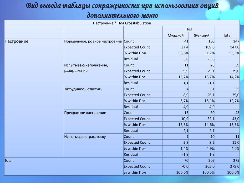 Вид вывода таблицы сопряженности при использовании опцийдополнительного меню