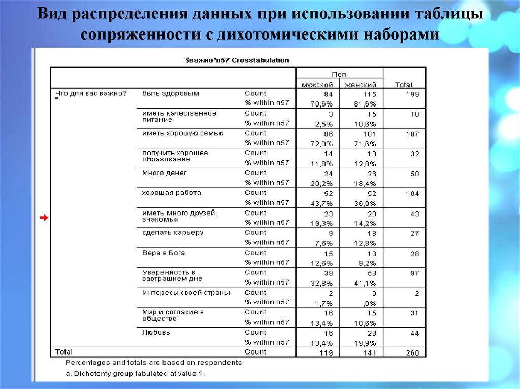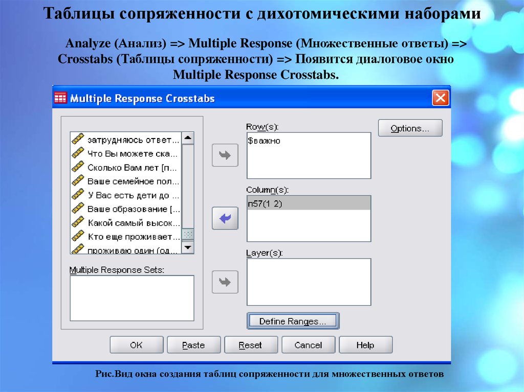 Таблицы сопряженности с дихотомическими наборамиAnalyze (Анализ) => Multiple Response (Множественные ответы) =>