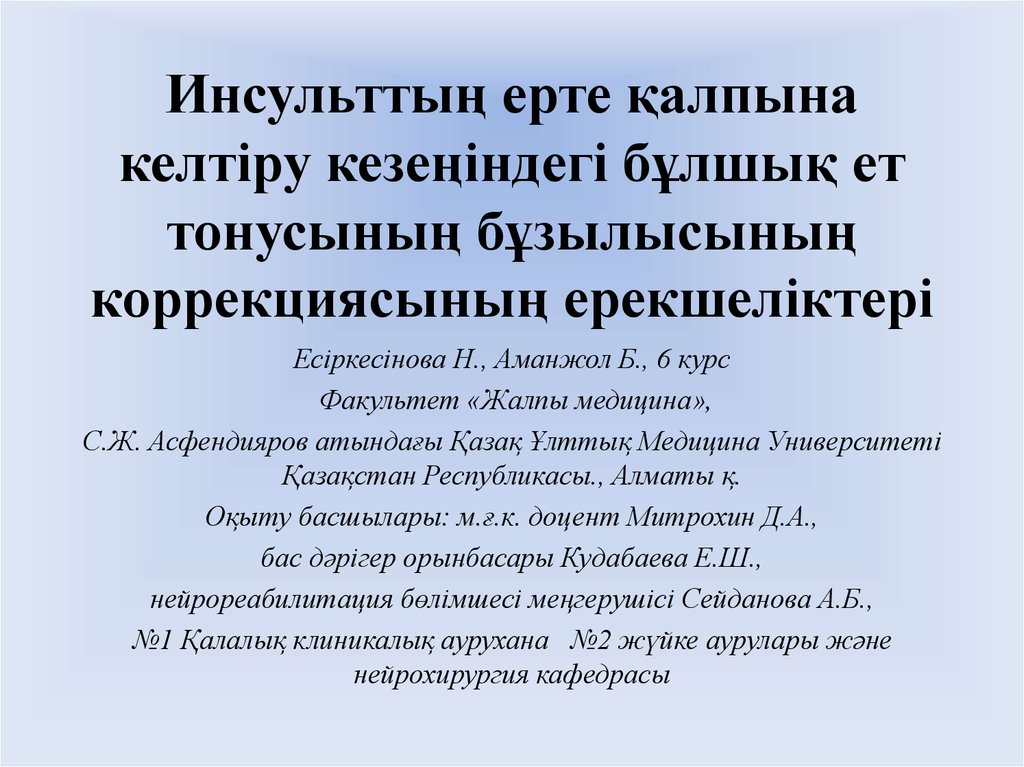 1. Инсульттың ерте қалпына келтіру кезеңіндегі бұлшық ет тонусының бұзылысының коррекциясының ерекшеліктері