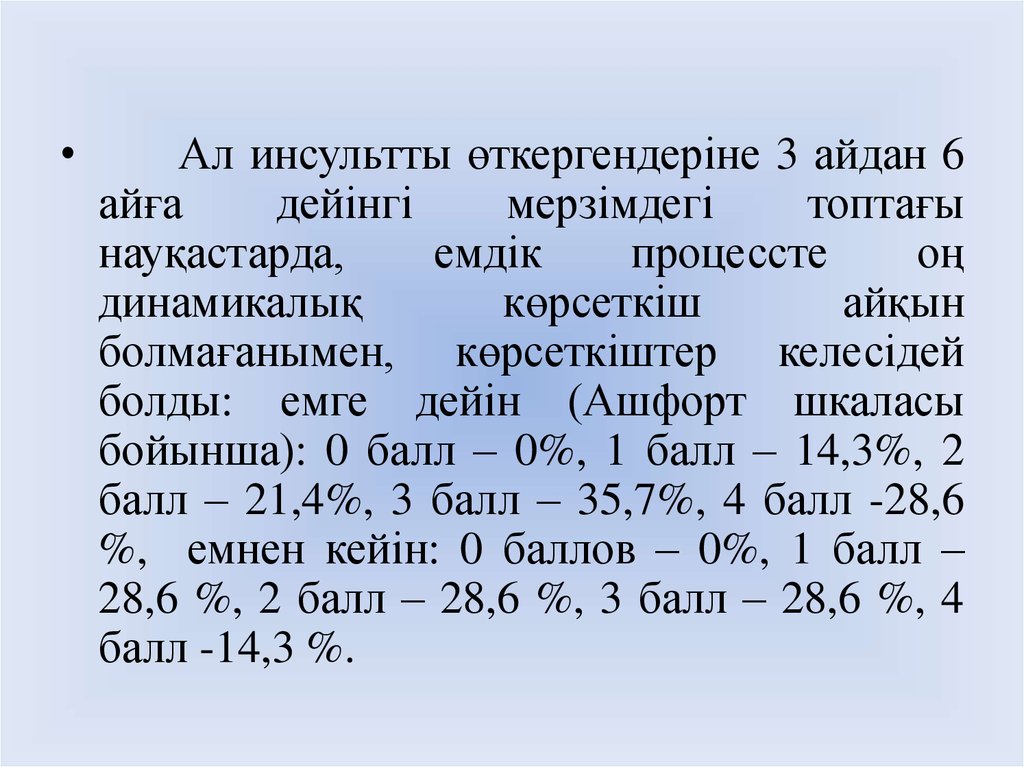 алғандарына 3 айға дейінгі мерзімдегі 13 науқас, екінші топқа инсульт