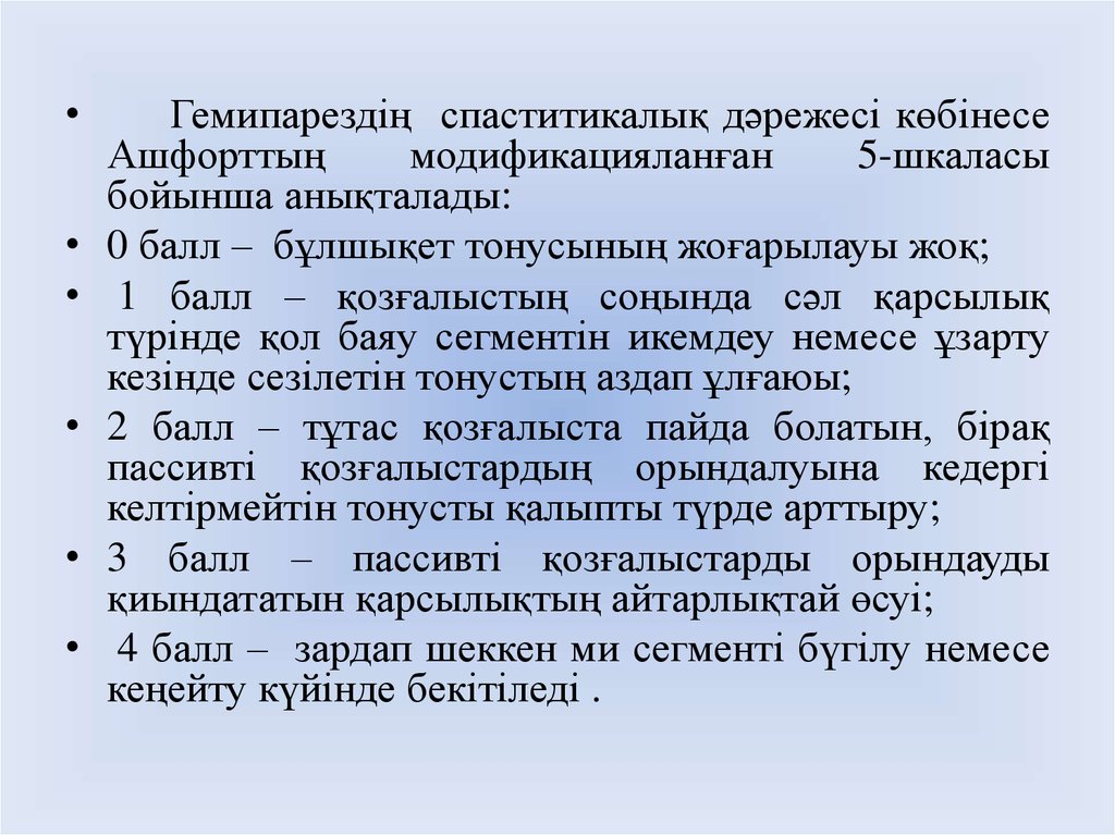 0 балл – бұлшықет тонусының жоғарылауы жоқ;