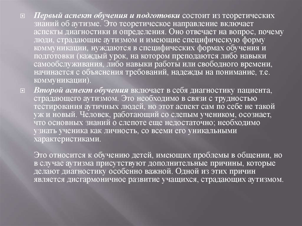 Первый аспект обучения и подготовки состоит из теоретическихзнаний об аутизме. Это теоретическое направление включает