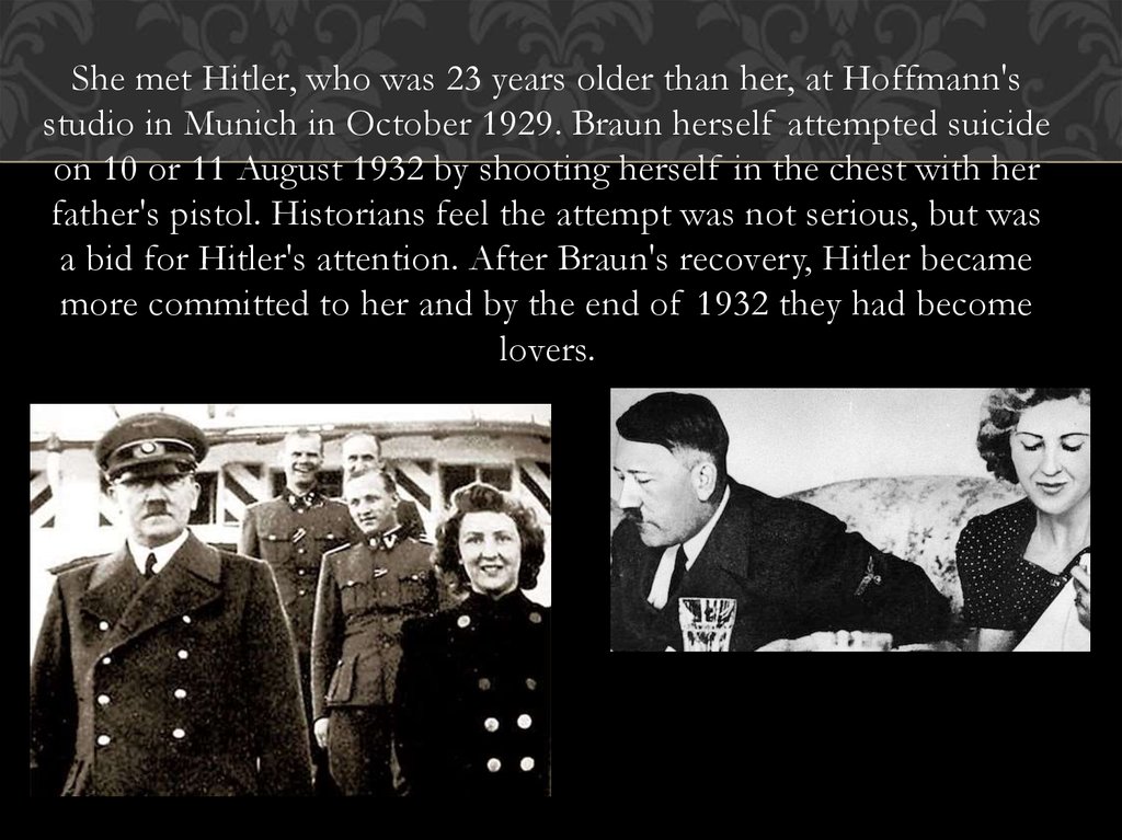 She met Hitler, who was 23 years older than her, at Hoffmann'sstudio in Munich in October 1929. Braun herself attempted suicide