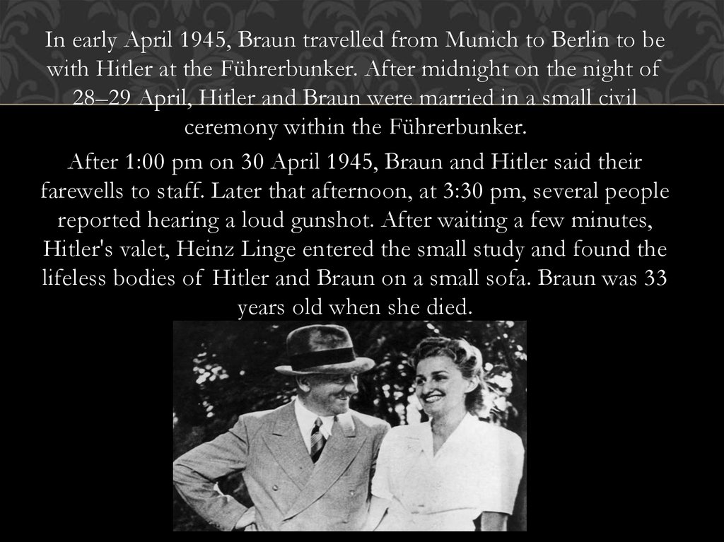 In early April 1945, Braun travelled from Munich to Berlin to bewith Hitler at the Führerbunker. After midnight on the night of
