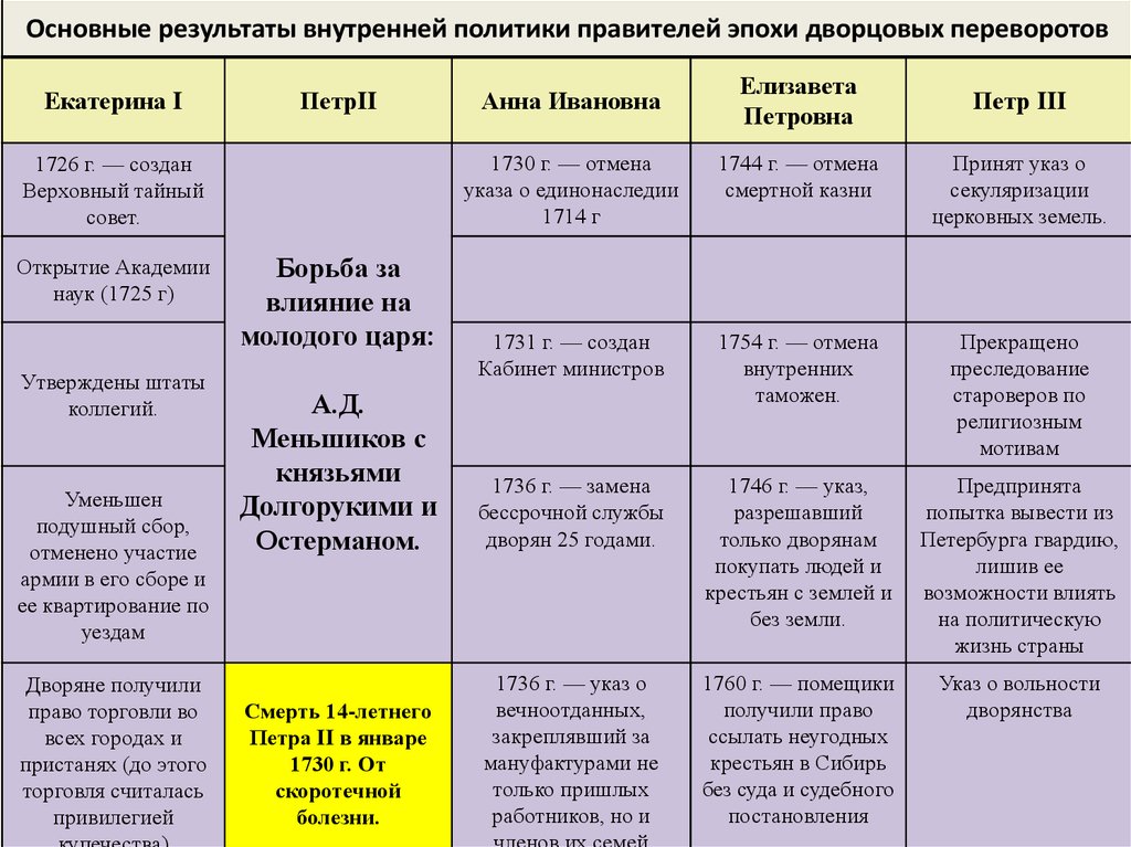 Основные результаты внутренней политики правителей эпохи дворцовых переворотовЕкатерина I