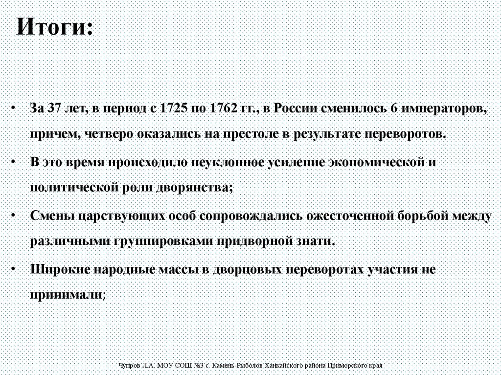 Итоги:• За 37 лет, в период с 1725 по 1762 гг., в России сменилось 6 императоров,