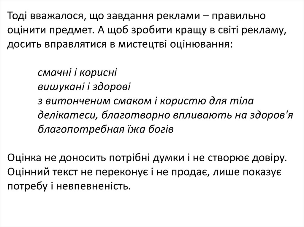 Тоді вважалося, що завдання реклами – правильнооцінити предмет. А щоб зробити кращу в світі рекламу,
