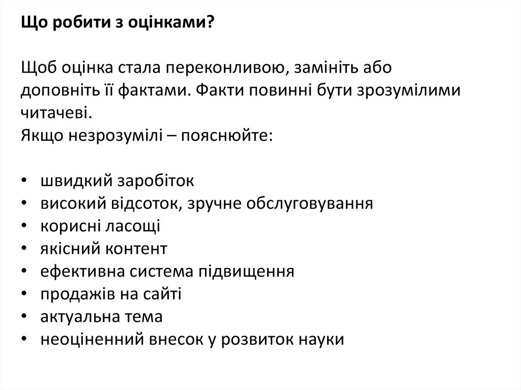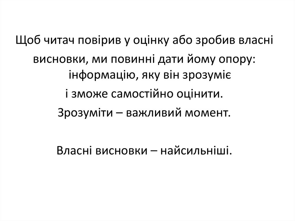 Щоб читач повірив у оцінку або зробив власнівисновки, ми повинні дати йому опору: