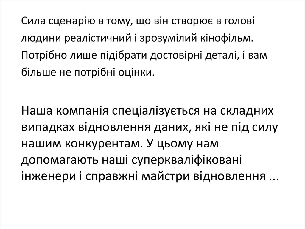 Сила сценарію в тому, що він створює в головілюдини реалістичний і зрозумілий кінофільм.
