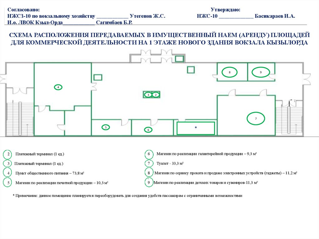 Схема расположения передаваемых в имущественный наем площадей для коммерческой деятельности в старом здании вокзала Кызылорда