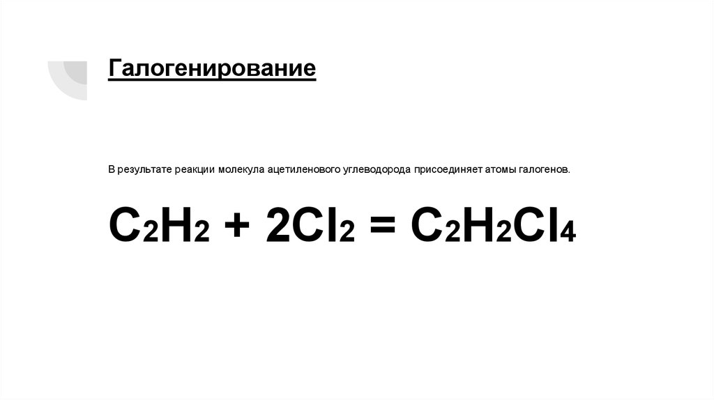 ГалогенированиеВ результате реакции молекула ацетиленового углеводорода присоединяет атомы галогенов.