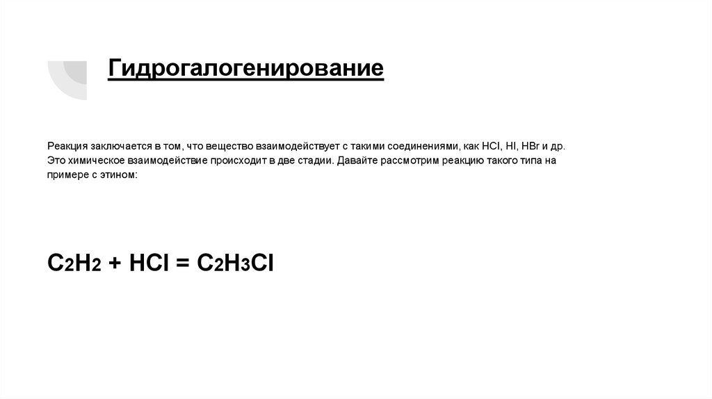 ГидрогалогенированиеРеакция заключается в том, что вещество взаимодействует с такими соединениями, как НСІ, НІ, HBr и др.