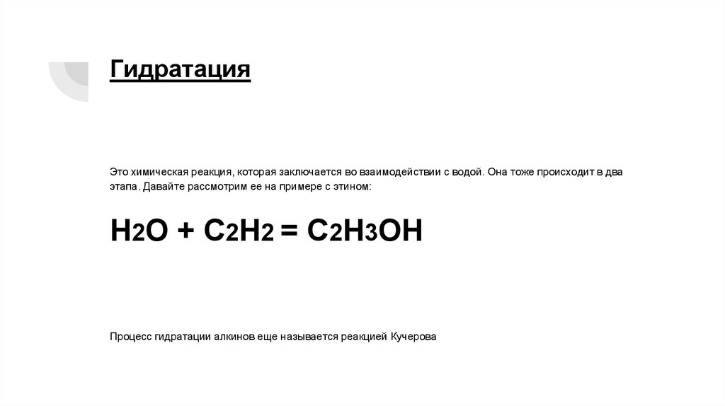 ГидратацияЭто химическая реакция, которая заключается во взаимодействии с водой. Она тоже происходит в два