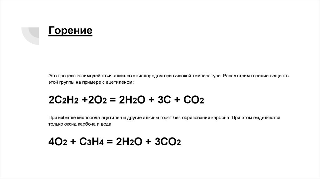 ГорениеЭто процесс взаимодействия алкинов с кислородом при высокой температуре. Рассмотрим горение веществ