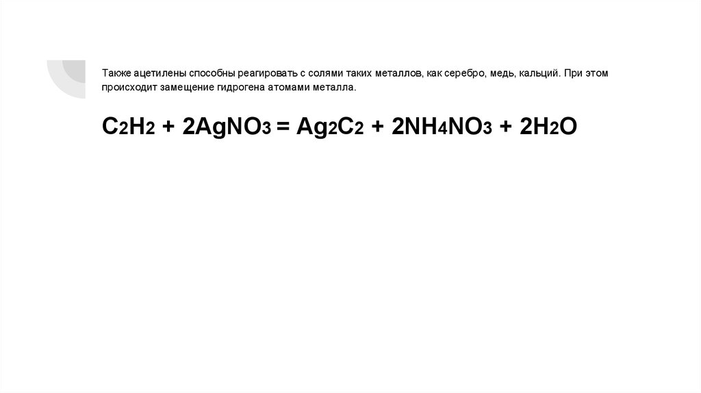 Также ацетилены способны реагировать с солями таких металлов, как серебро, медь, кальций. При этомпроисходит замещение гидрогена атомами металла.