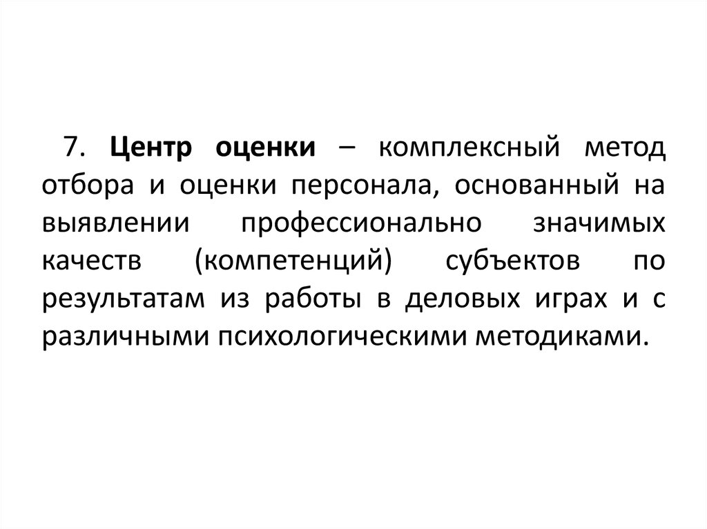 7. Центр оценки – комплексный методотбора и оценки персонала, основанный на