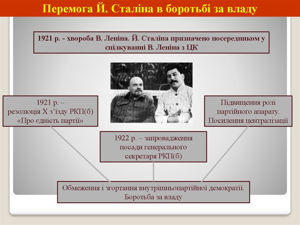 Перемога Й. Сталіна в боротьбі за владу1921 р. - хвороба В. Леніна. Й. Сталіна призначено посередником у