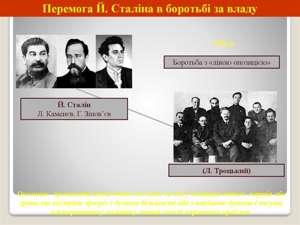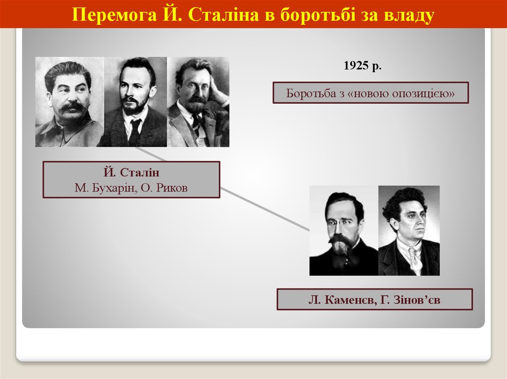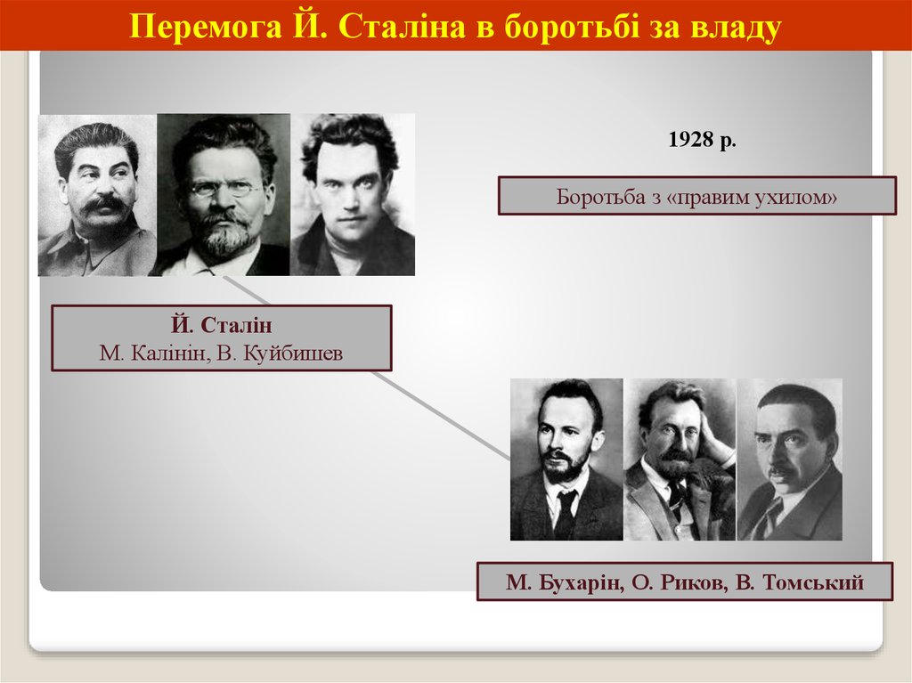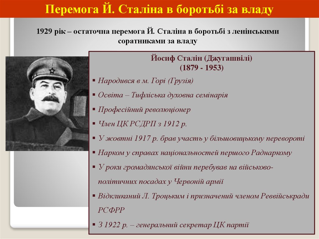Перемога Й. Сталіна в боротьбі за владу1929 рік – остаточна перемога Й. Сталіна в боротьбі з ленінськими