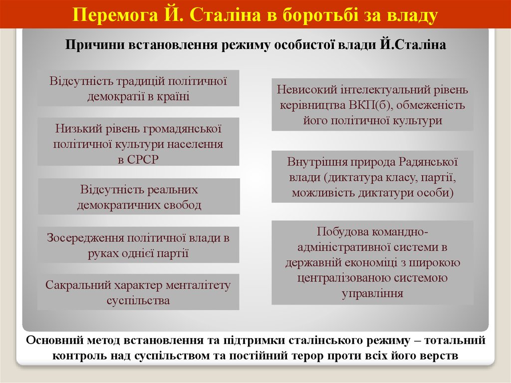 Перемога Й. Сталіна в боротьбі за владуПричини встановлення режиму особистої влади Й.Сталіна