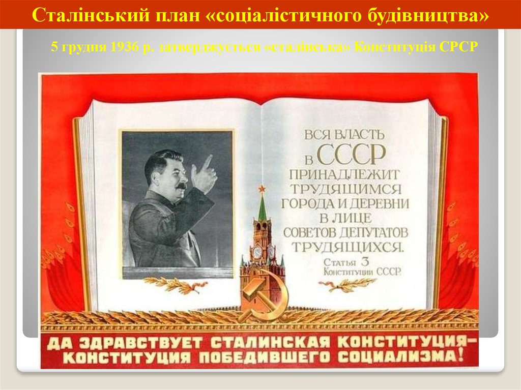 Сталінський план «соціалістичного будівництва»5 грудня 1936 р. затверджується «сталінська» Конституція СРСР