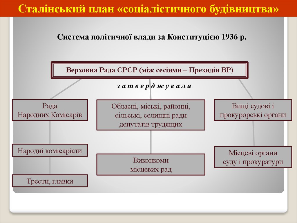 Сталінський план «соціалістичного будівництва»Система політичної влади за Конституцією 1936 р.