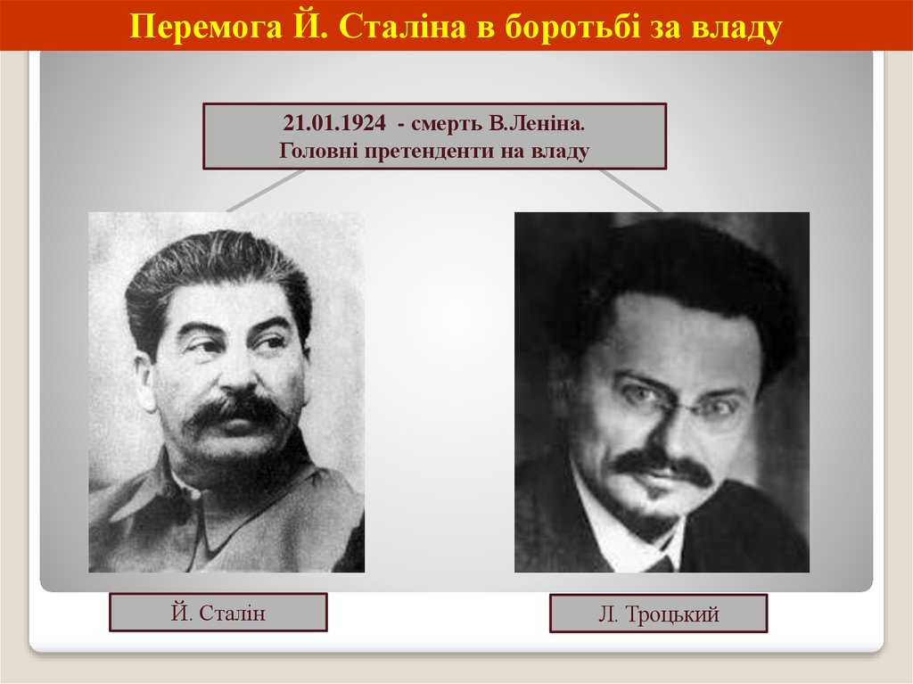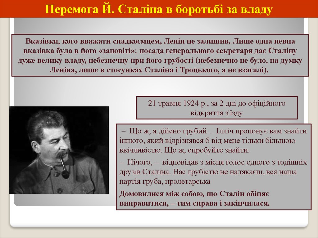 Перемога Й. Сталіна в боротьбі за владуВказівки, кого вважати спадкоємцем, Ленін не залишив. Лише одна певна