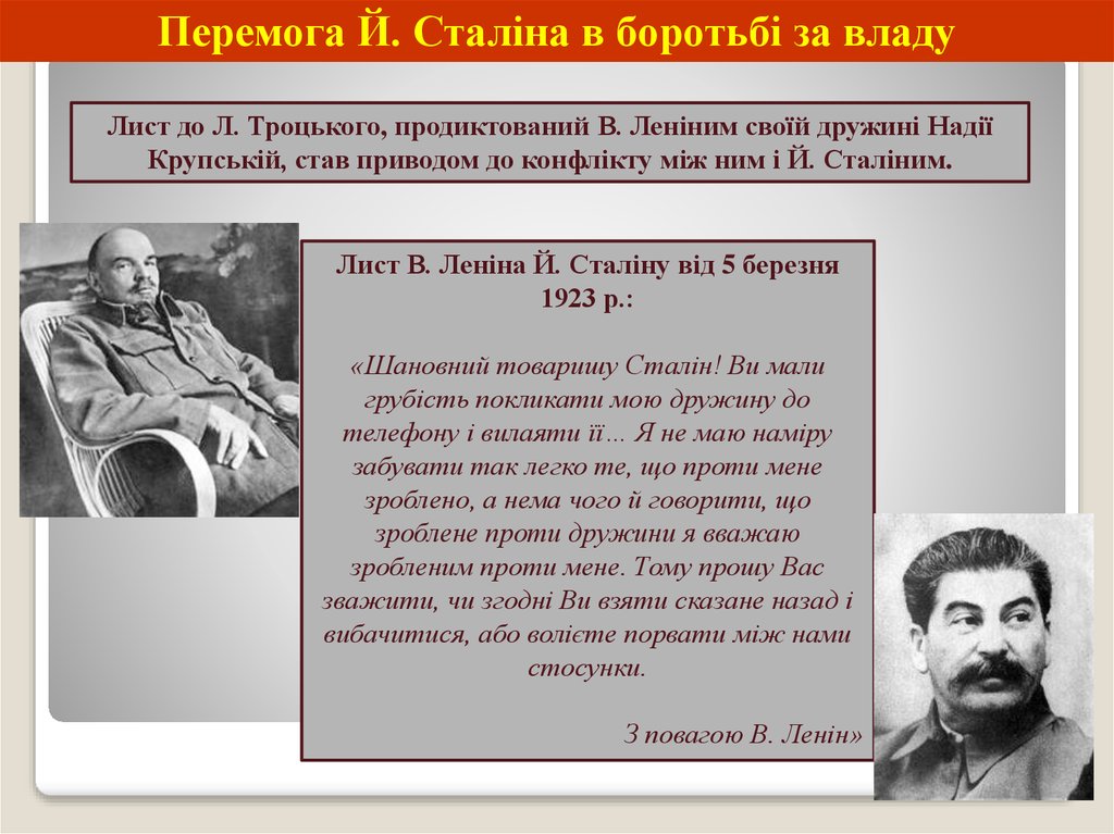 Перемога Й. Сталіна в боротьбі за владуЛист до Л. Троцького, продиктований В. Леніним своїй дружині Надії