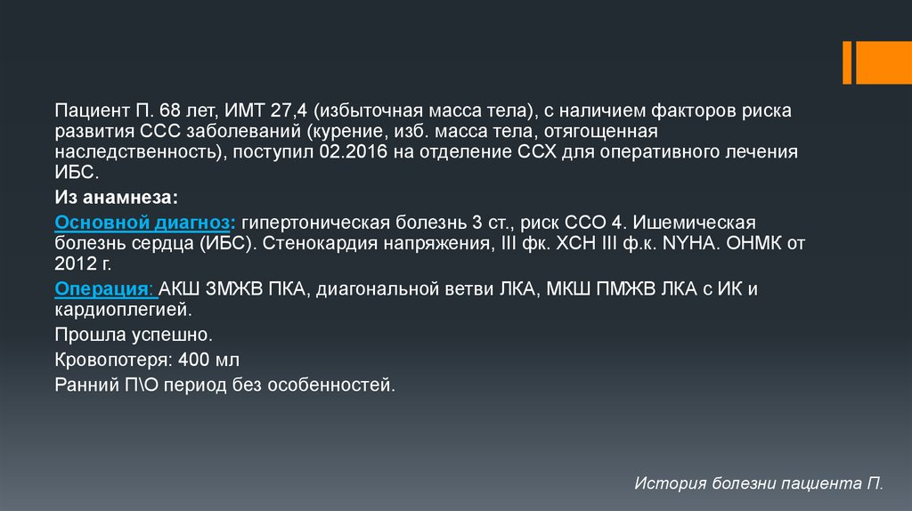 Пациент П. 68 лет, ИМТ 27,4 (избыточная масса тела), с наличием факторов рискаразвития ССС заболеваний (курение, изб. масса тела, отягощенная