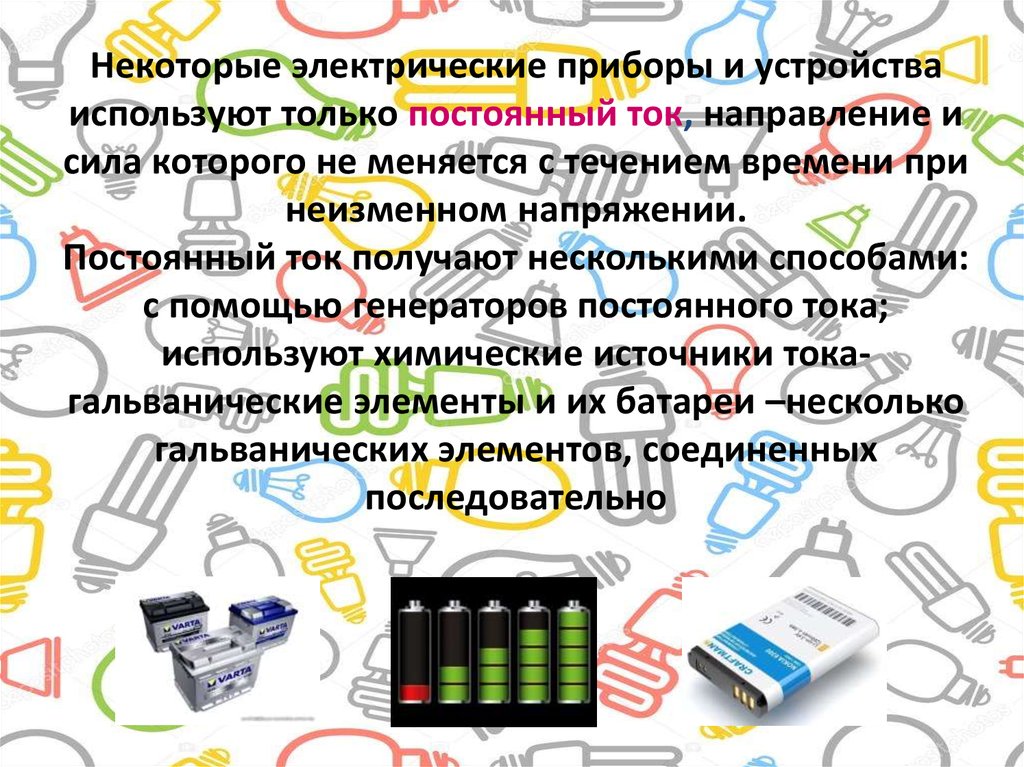 Некоторые электрические приборы и устройстваиспользуют только постоянный ток, направление и